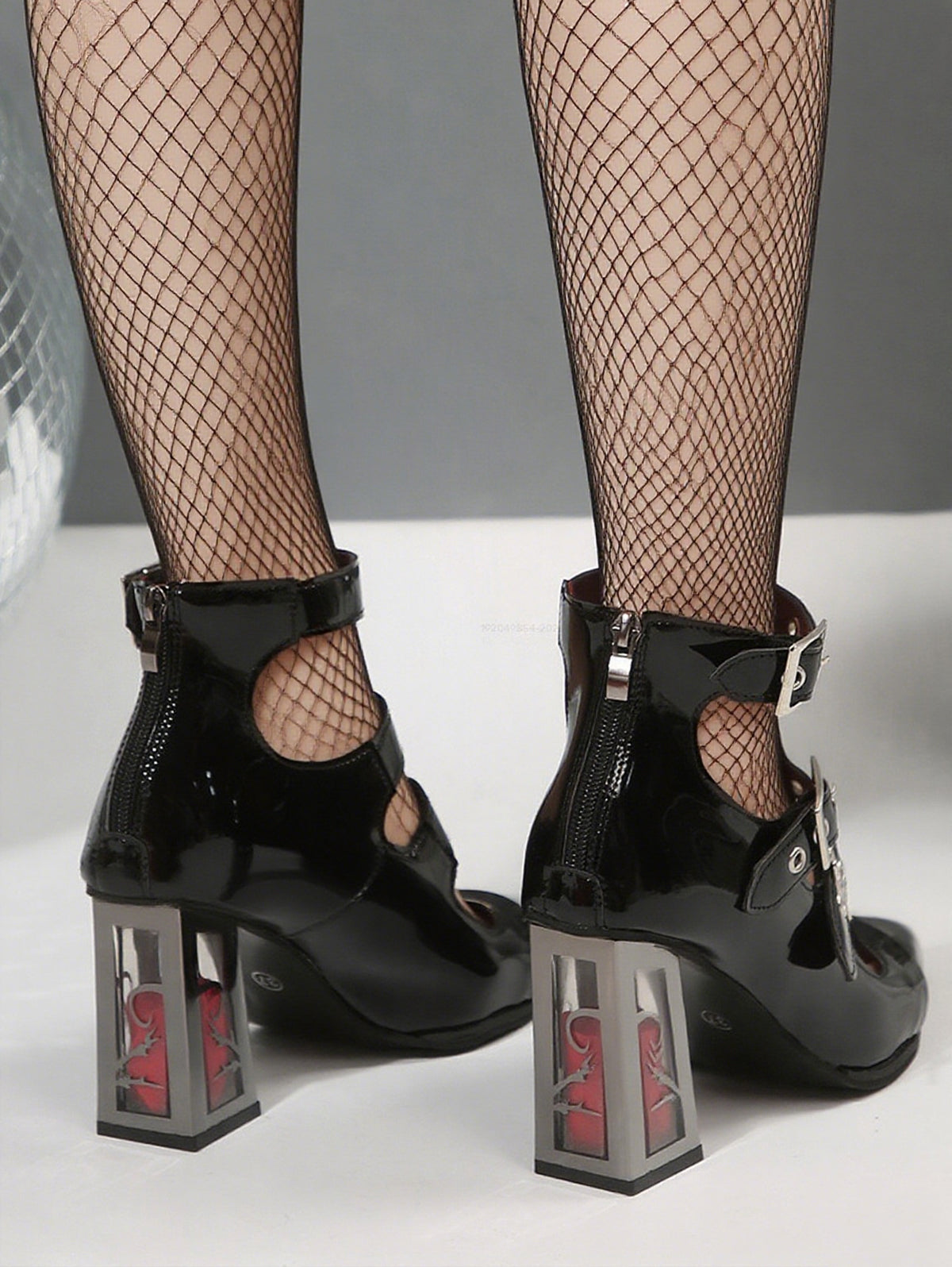 Grommet Buckle Strap Chunky Heel Pointed Toe Zip Punk Sandals