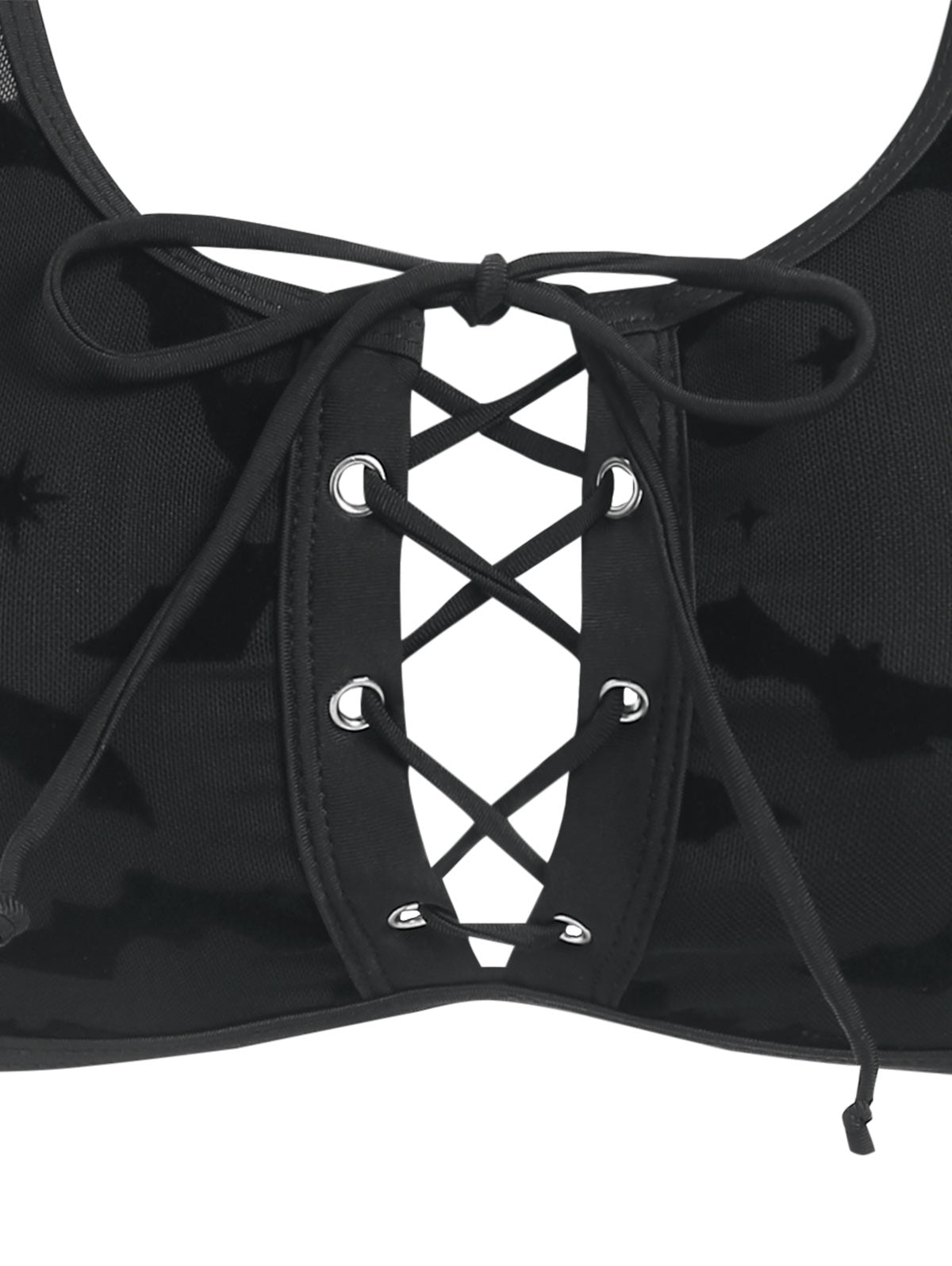 Update your holiday look with this tank bikini. Featuring a mesh overlay with bat patterns, and inviting lace-up detailing. Add some statement accessories to finish the look.