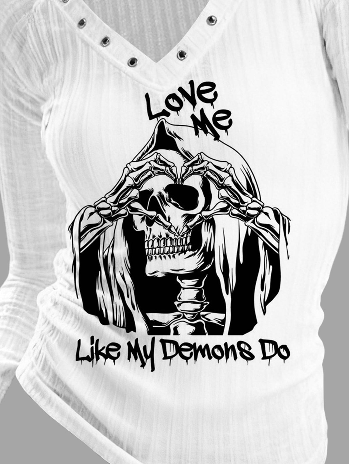 Gothic V-neck Ribbed Reaper & Demon's Word Printed Long-sleeve T-shirt (Slightly Sheer)