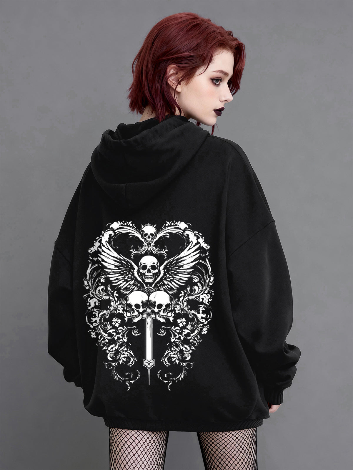 GothicOversized Hoodie-Skull & Cross Print Long Sleeve Hooded Sweatshirt