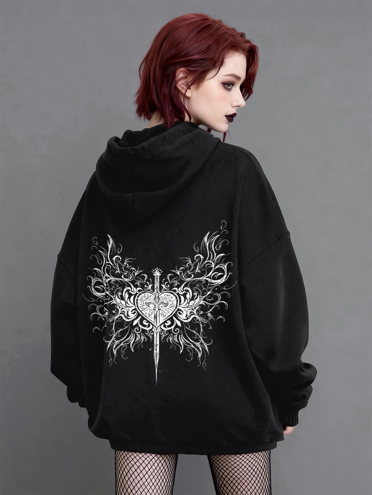 Gothic Oversized Hoodie-Sword Through Heart Print Long Sleeve Hooded Sweatshirt
